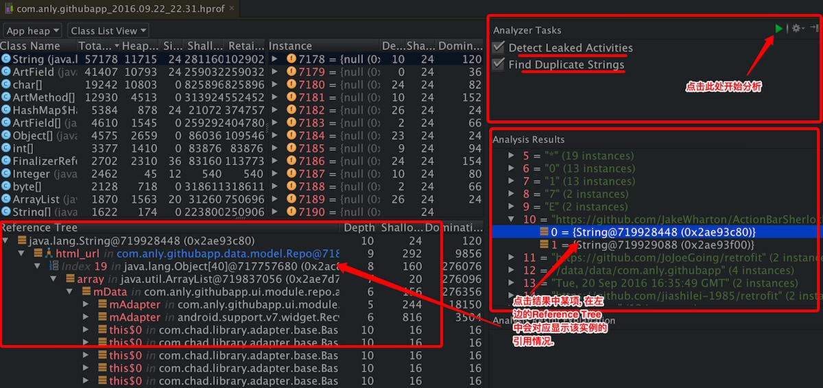- ② Dump Java Heap按钮, 点击会在该调试工程的captures目录生成一个类似这样"com.anly.githubapp_2016.09.21_23.42.hprof"命名的hprof文件, 并打开Android Studio的HPROF Viewer显示该文件内容.