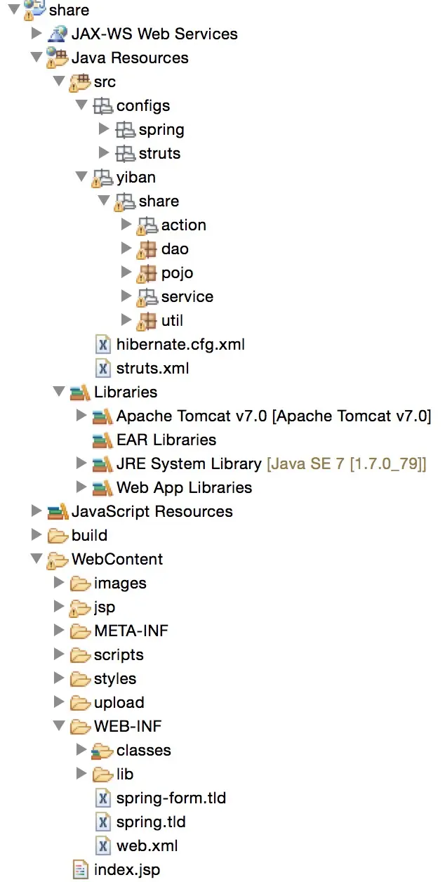 - Libraries-所有的jar文件,包括tomcat,jre,外部引入的SSH2的jar包