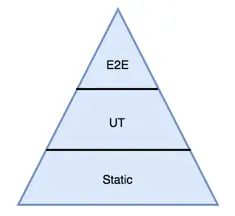 自动化测试是是一个塔型体系。静态检查是必须的,作为团队规范存在,覆盖全部代码。UT是局部覆盖的,关注基础功能。E2E是可选的,关注主流程和回归测试。