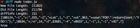 可以看到 build 之后的代码有 21w 多个字符(212KB),而 diff 信息却相当短小,只有151个字符,相比于重新加载新版本,缩小了1000多倍(当然我这里只改了两三行代码,小是自然的)。