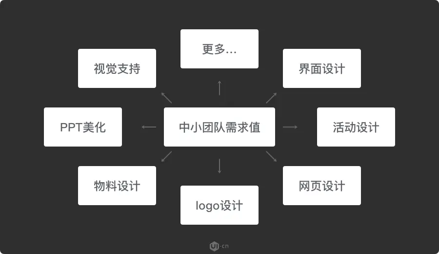 小结:在中小团队你需要具备专业广度,从最全面的需求来看你可能会遇到这些工作:logo 设计、宣传物料设计、活动专题页设计及推广需求设计、移动端界面设计、网页设计、基础摄影与修图、PPT 美化等等一切视觉支持;延展技能可能需要有产品思维和交互输出能力等。