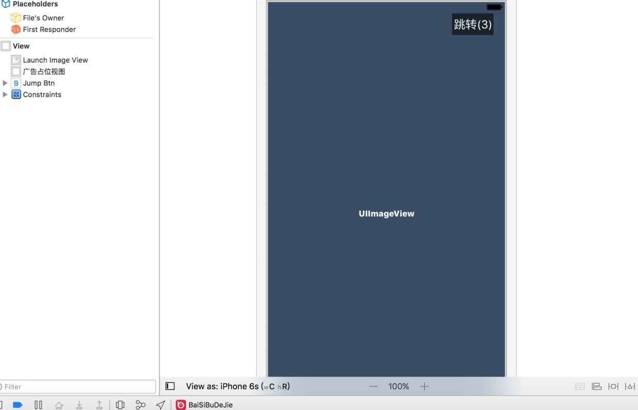 2.捋一捋Nib中的层级关系 App的启动页->广告->跳过Button 这里有一点需要注意 跳过的这个Button是和广告的这个View同级的 并不是镶嵌在View里 不然的话 等广告图片出来以后 Button会被遮挡住