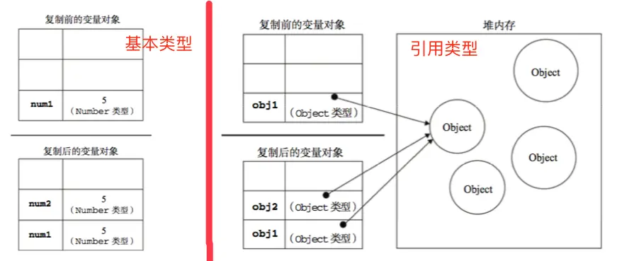 JavaScript变量分为两种:基本类型和引用类型。其中基本类型就是前面提到的5种基本数据类型,引用类型就是前面提到的Object以及基于它的其他复杂数据类型。
