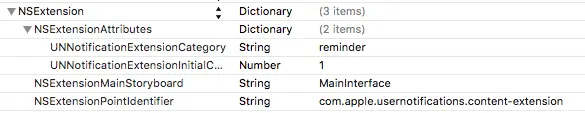 具体实现这一步,需要打开 extension 的 Info.plist,展开 NSExtensionAttributes Dictionary,把下面 UNNotificationExtensionCategory 这个键对应的值改为通知 category 的名字("reminder")。注意,这个值既可以填一个 string ,也可以填一个 string 数组,如果想让多个通知 category 共用一个 extension 界面就可以填 string 数组。