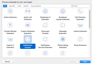 首先,我们要给闹钟 app 的工程加一个新的 target。在下面这个选择 target 模板的界面,选择 Notification Content。然后随便起个名字,我用的是 NagMeContentExtension。