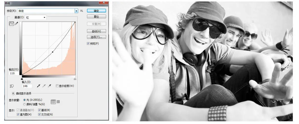 b.进入通道面板,单独选择红通道,执行图像→调整→曲线命令,整体曲线的形状,使红通道变暗,减少图像中红色所占比例;