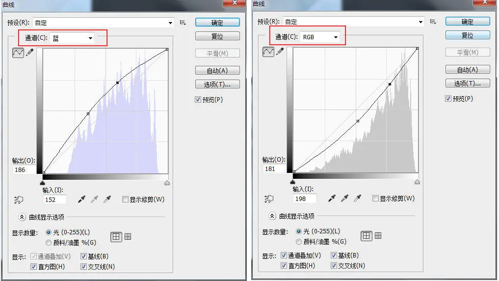 c.再选择蓝通道,执行图像→调整→曲线命令,整体曲线的形状,同样减少图像中的蓝色;