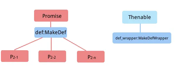 对于Promise实现而言, 主要的主体类型就两个-----Promise和Thenable. NPO中通过MakeDef构建Promise的内部状态结构体def, 并且通过def.chain存储Promise子节点P2-1,P2-2到P2-n, 从而形成一颗Promise树. 而Thenable的内部状态结构体def_wrapper则由MakeDefWrapper构建而成.