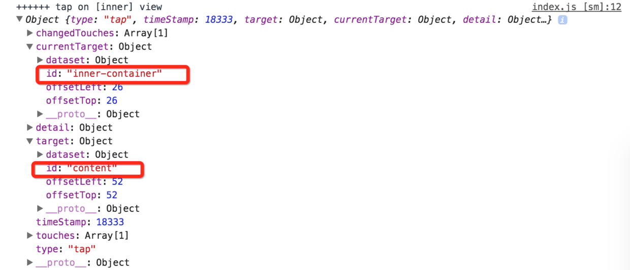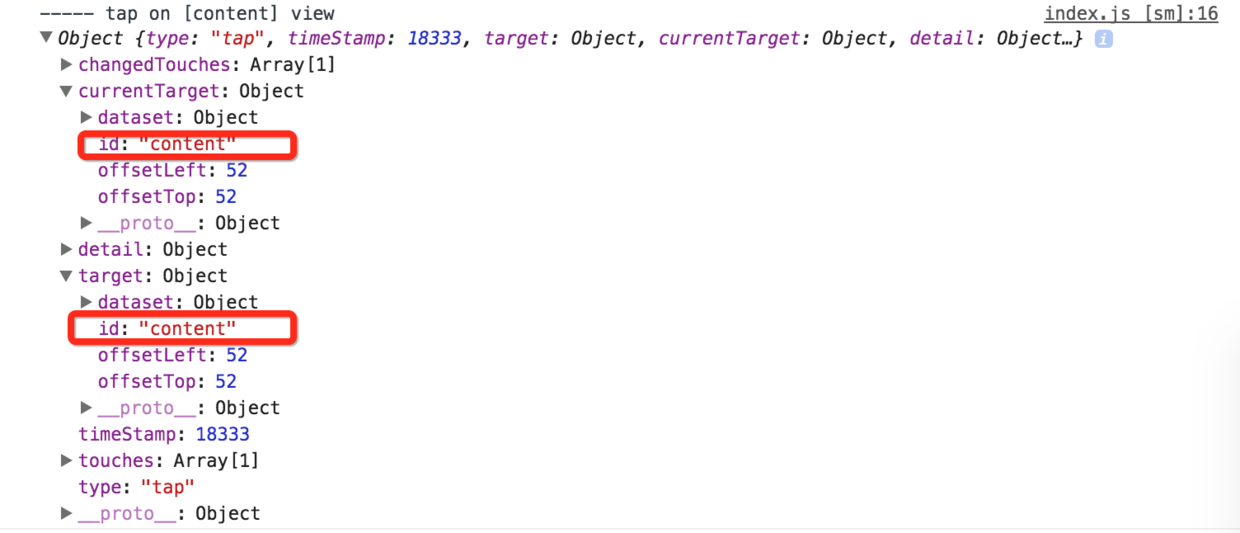 我们可以看到,在content的tap事件处理函数中,event里面的target和currentTarget的id都是content。