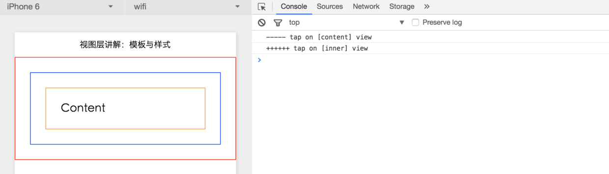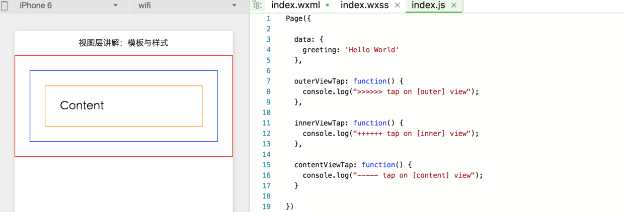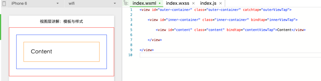 在这个示例代码中,有三个逐级嵌套的view元素,最里层的是content元素,最外层的为outer-container元素。最里层和最外层的元素上,使用了bind属性绑定了tap事件的处理函数,而中间的innner-container上,使用了catch属性进行tap事件绑定。