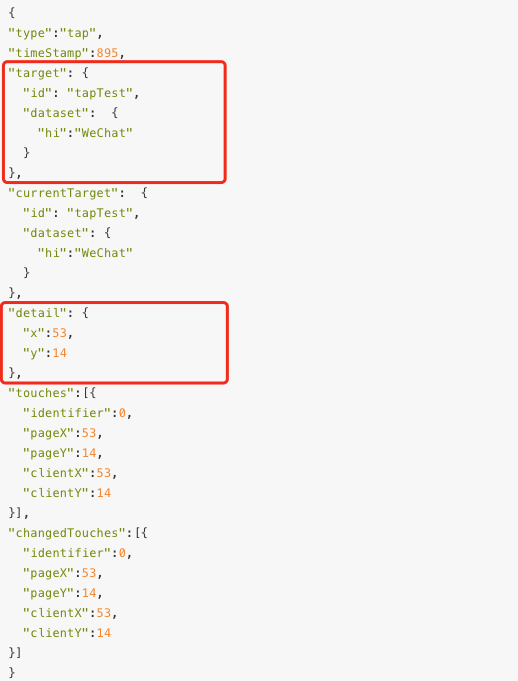 这里我们可以看到,在event对象中,包含了事件的名称,事件目标对象的信息,以及事件发生的在界面上的位置信息等等。我们在组件上设置的data-hi属性的值,也在target中的dataset上被携带了过来,这是比较有用的,在实际开发中,我们可以利用这个特性,来传递更多视图层的信息到逻辑层进行处理。