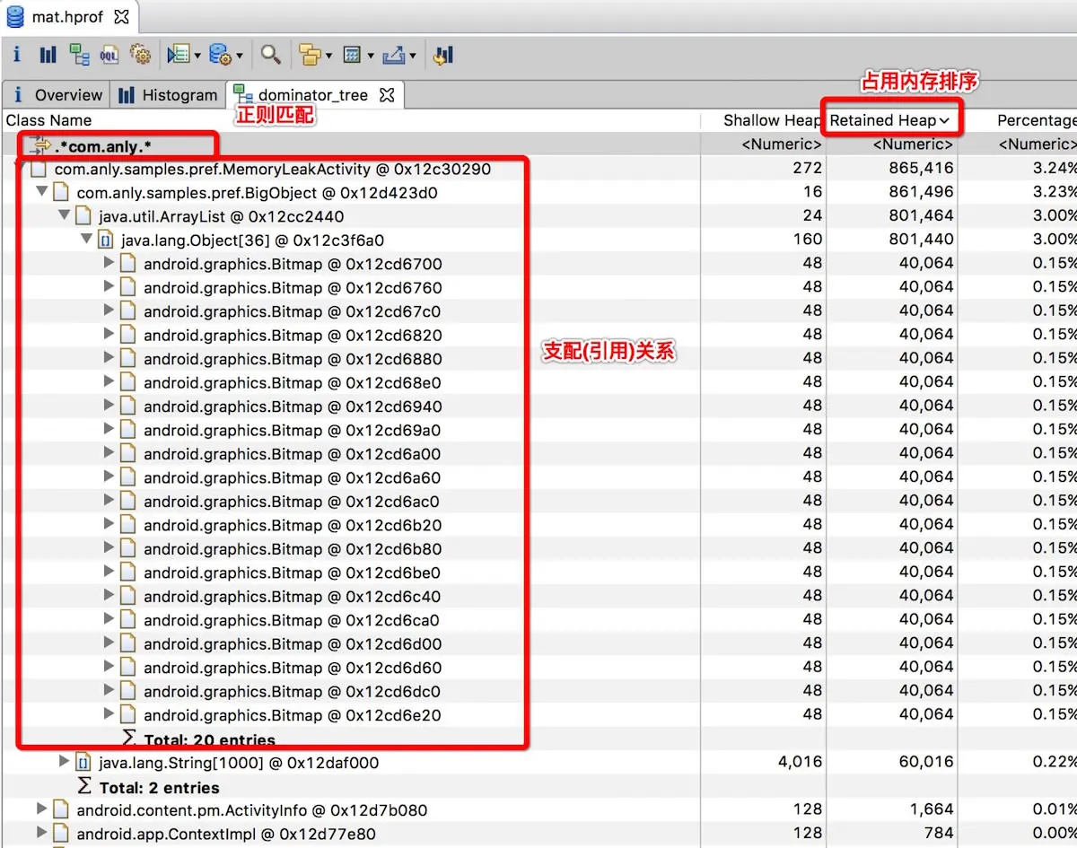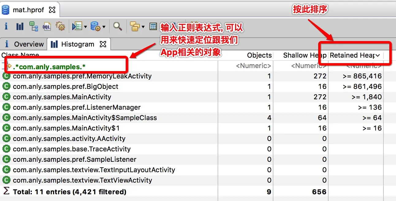 $ hprof-conv com.anly.samples_2016.10.31_15.07.hprof mat.hprof3.1 Histogram视图定位内存消耗