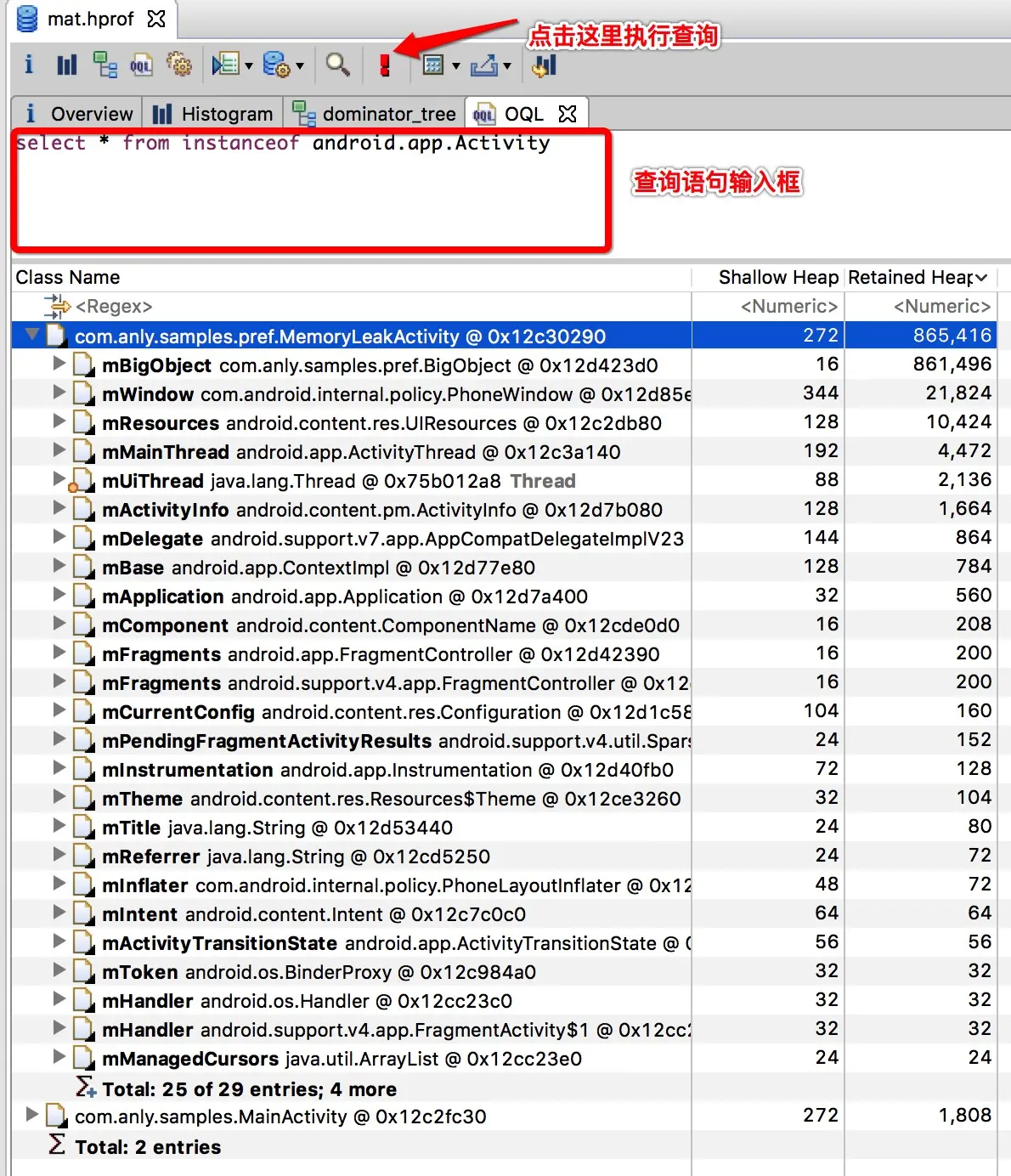 对于Android App开发来说, 大部分的内存问题都跟四大组件, 尤其是Activity相关, 故而我们会想查出所有Activity实例的内存占用情况, 可以使用OQL来查询: