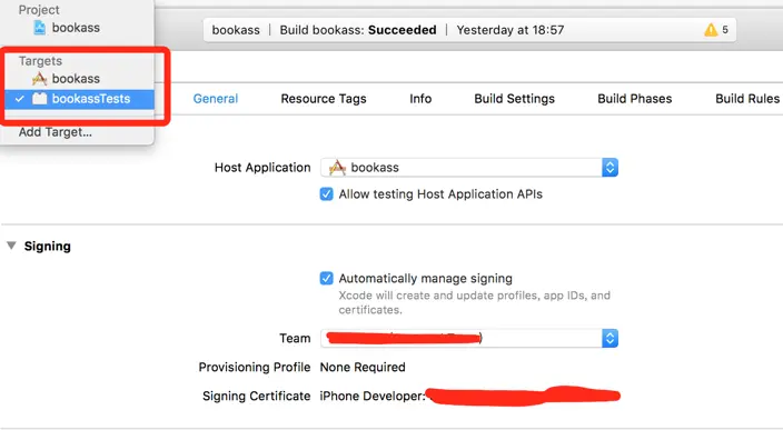 再点运行,又报错了: Code signing is required for product type 'Unit Test Bundle' in SDK 'iOS 8.0'