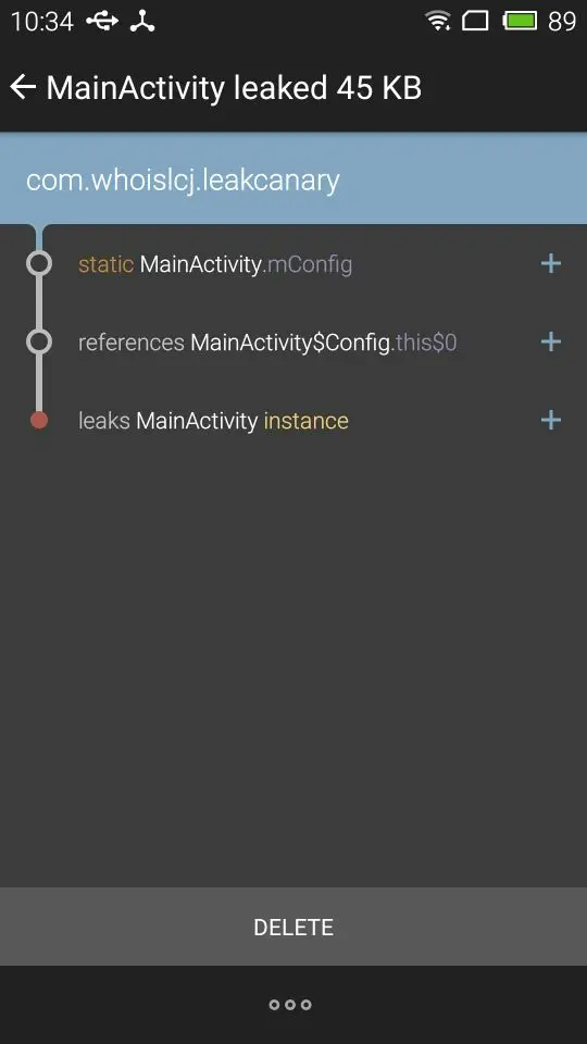 上述代码看着没有任何问题,其实内部类都会持有一个外部类引用,这里这个外部类就是MainActivity,然而内部类实例又是static静态变量其生命周期与Application生命周期一样,所以在MainActivity关闭的时候,内部类静态实例依然持有对MainActivity的引用,导致MainActivity无法被回收释放,引发内存泄漏。LeakCanary检测内存泄漏结果如下: