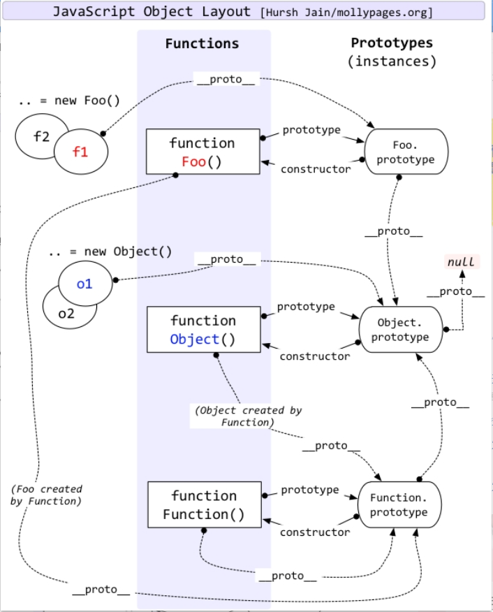 对于Function这一特殊的构造函数,就有点像先有鸡还是先有蛋的伪命题了,继续追根溯源,一般来说,一个对象的proto属性指向这个对象的构造器函数的prototype对象,对构造函数对象在外部添加或减少属性对产生的对象并没有什么影响,其中所有对象都起源于Object.prototype,这个对象的proto属性指向null,这里用这张图来解释他们的关系
