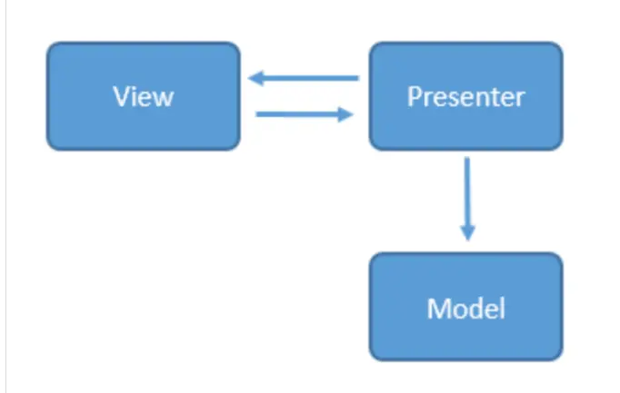 View层只负责与View有关的,操作View层时发出的事件传递给Presenter,Presenter去操作Model,操作完Model,再去通知View相应更新。