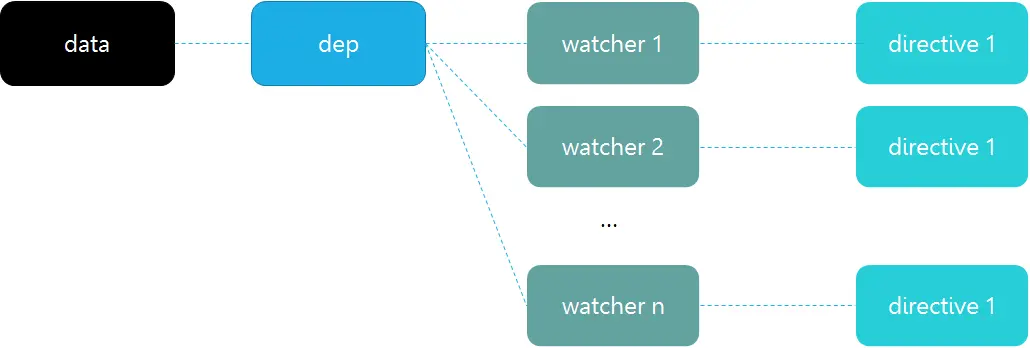 在对数据进行读取时,如果当前有 Watcher(对数据的观察者吧,watcher 会负责将获取的新数据发送给视图),那将该 Watcher 绑定到当前的数据上(dep.depend(),dep 关联当前数据和所有的 watcher 的依赖关系),是一个检查并记录依赖的过程。而在对数据进行赋值时,如果数据发生改变,则通知所有的 watcher(借助 dep.notify())。这样,即便是我们手动改变了数据,框架也能够自动将数据同步到视图。