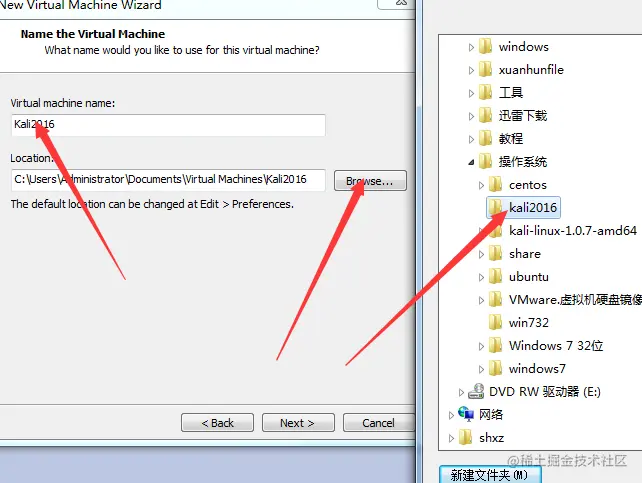 单击“下一步”。填写虚拟机名称,打开文件浏览对话框,选择文件存储位置。