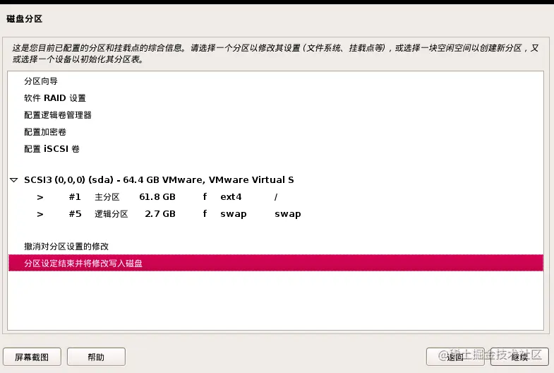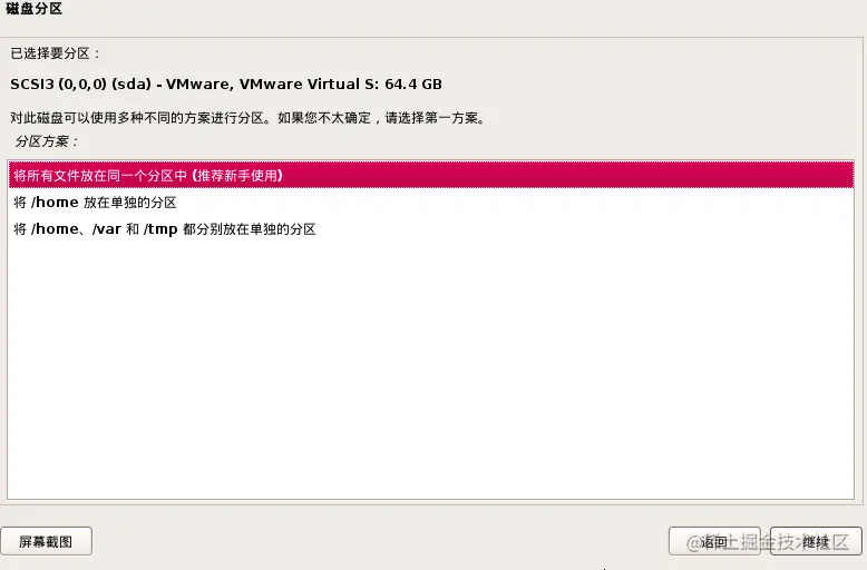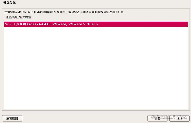 单击继续,选择分区。这里我选择的是整个磁盘安装,所以只有一个选项,如图29。