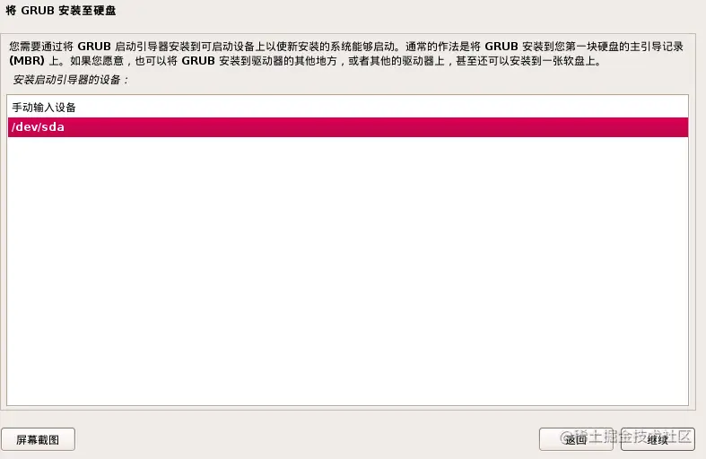 单击“继续”。选择是,将grub安装在MBR记录上。如图35。