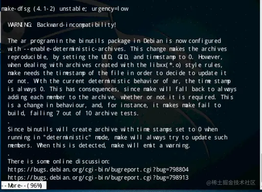 紧接着会出现更新声明的内容,一路回车到100%,然后输入“:q”,进入软件包更新环节,如图46,47所示。