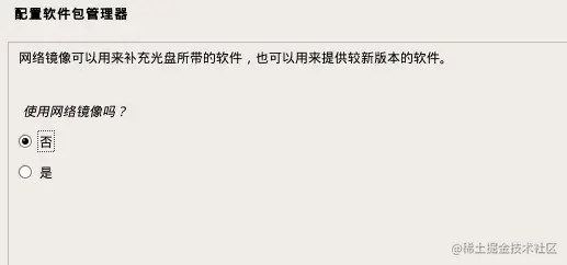 安装过程中,会出现是否选择网络镜像的选项,记得一定要选“否”,如图34。
