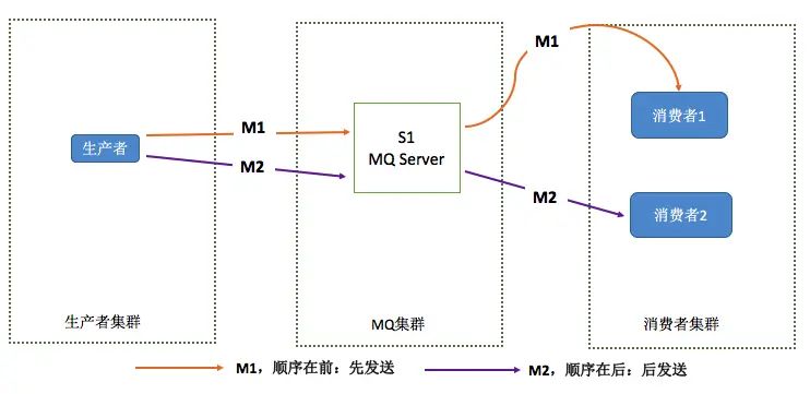 M1发送到S1后,M2发送到S2,如果要保证M1先于M2被消费,那么需要M1到达消费端后,通知S2,然后S2再将M2发送到消费端。