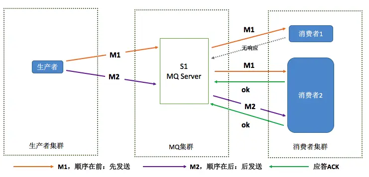 这样的模型就严格保证消息的顺序,细心的你仍然会发现问题,消费端1没有响应Server时有两种情况,一种是M1确实没有到达,另外一种情况是消费端1已经响应,但是Server端没有收到。如果是第二种情况,重发M1,就会造成M1被重复消费。也就是我们后面要说的第二个问题,消息重复问题。