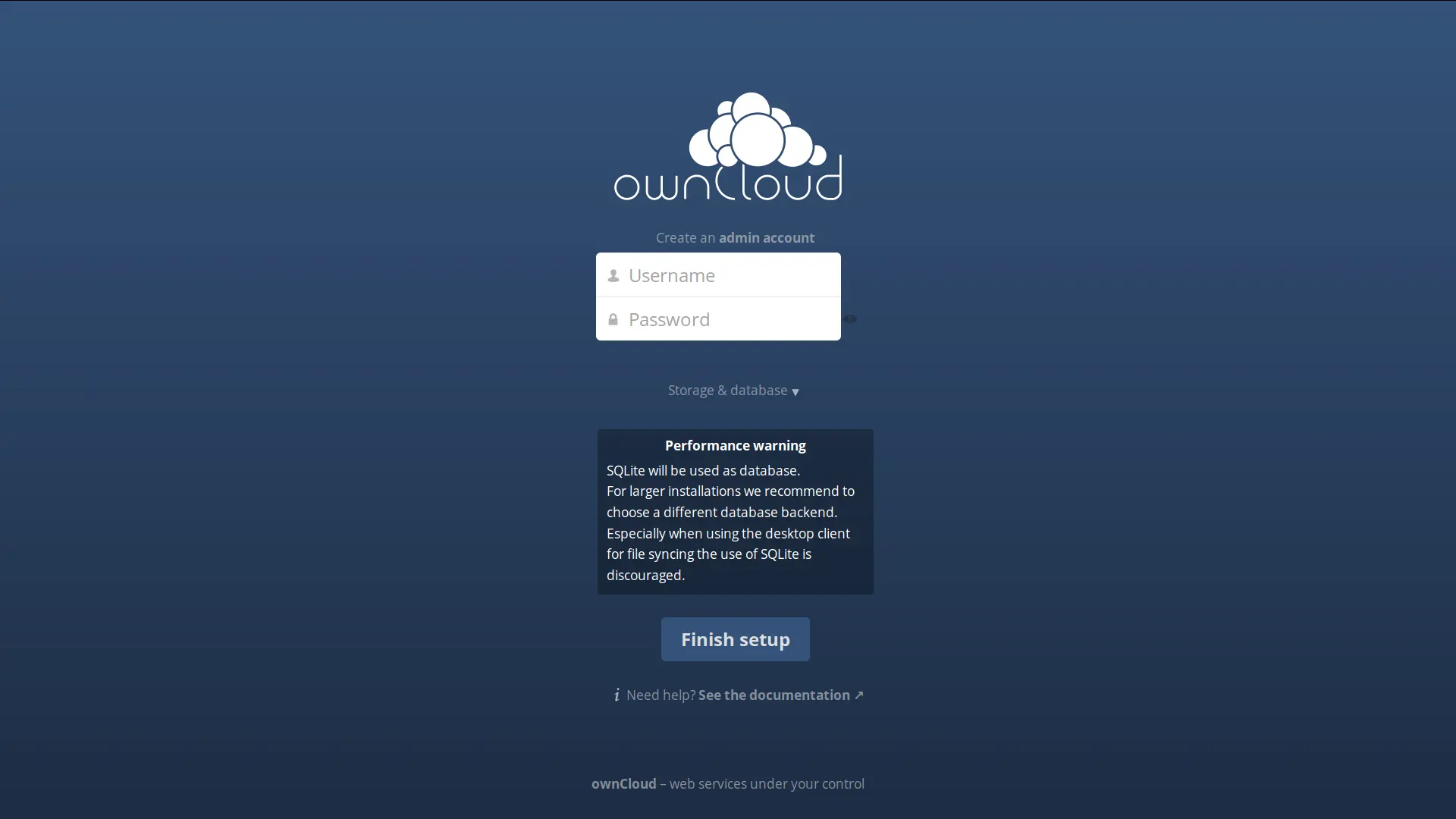 访问你 VPS 的 8080 端口(刚才配置文件里写了)打开 ownCloud 主页,需要做两件事