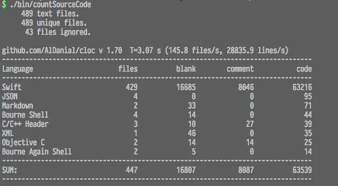 Swift 3 做为一个 Grand API Change 的语言版本,对我们来说,适配并不是一个轻松的工作,毕竟我们工程是从 Swift 1.1 版本开始一直开发到现在的一个纯 Swift 工程,代码量还是相当大的。下面是我们工程在适配之前的代码统计,其中还不包括我们自己的 framework 代码。