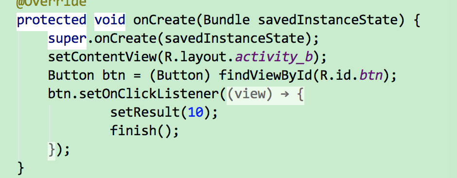 👌,来到了ActivityB,在Button的点击事件中设置结果码(设值任意 和响应吗没有关系 互不影响),代码如下