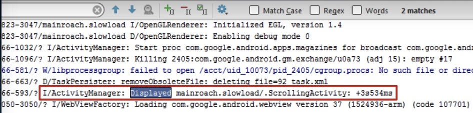 从API19之后,Android在系统Log中增加了Display的Log信息,通过过滤ActivityManager以及Display这两个关键字,可以找到系统中的这个Log: