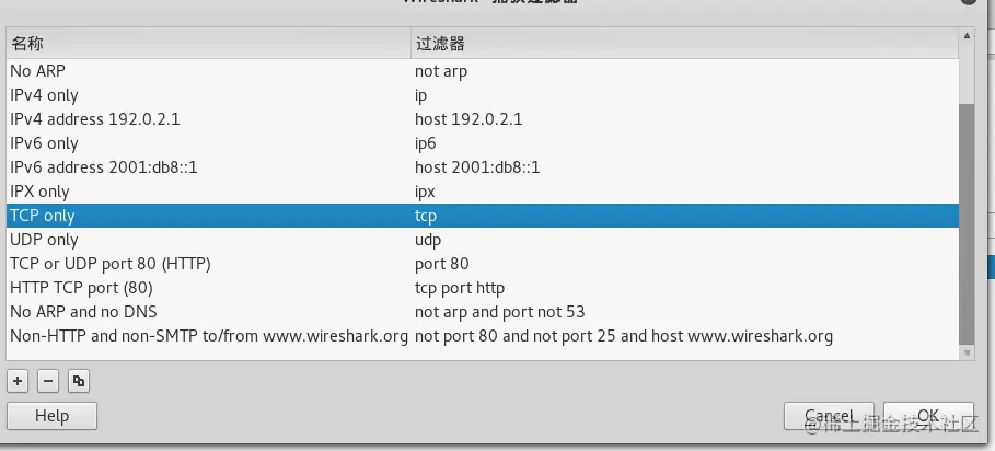 在捕获过滤器界面,我们可以看到已有的过滤器,可以修改删除它们,同时我们可以增加自己的过滤器。