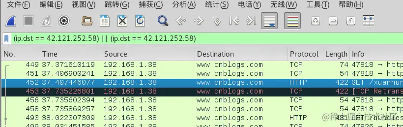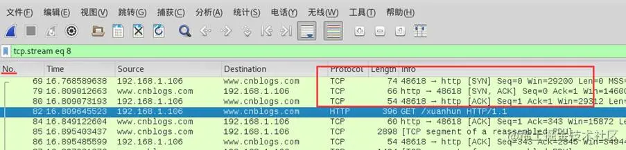 下面我们具体分析下实际三次握手的过程,打开Wireshark启动抓包,然后在浏览器打开我的博客www.cnblogs.com/xuanhun。