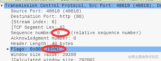 69号数据的TCP数据字段如图31所示,我们可以看到序列号为0,标志位为SYN。