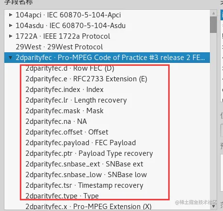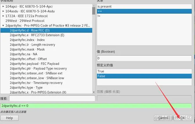 1.5.3.2 显示过滤器 显示过滤器用来过滤已经捕获的数据包。在数据包列表的上方,有一个显示过滤器输入框,可以直接输入过滤表达式,点击输入框右侧的表达式按钮,可以打开表达式编辑器,左侧框内是可供选择的字段。