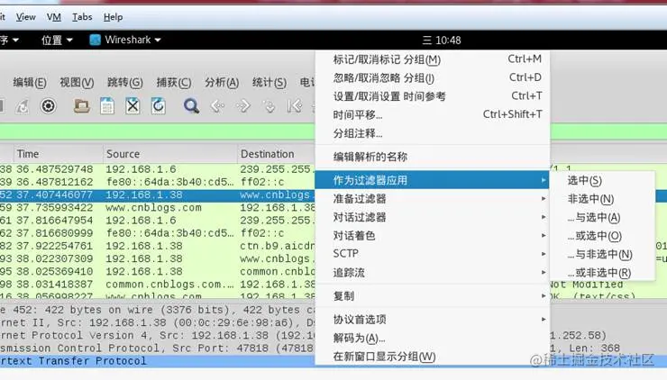此外我们也可以通过选中数据包来生成过滤器,右键——>作为过虑器应用。