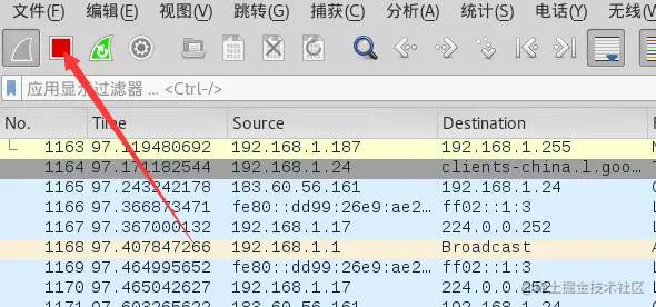 抓包的过程中,我们可以看到数据的变化。点击停止按钮,停止捕获数据包。