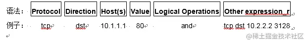 Protocol(协议): 可能的值: ether, fddi, ip, arp, rarp, decnet, lat, sca, moprc, mopdl, tcp and udp. 如果没有特别指明是什么协议,则默认使用所有支持的协议。 openmaniak.com/image/droit… Direction(方向): 可能的值: src, dst, src and dst, src or dst 如果没有特别指明来源或目的地,则默认使用 "src or dst" 作为关键字。