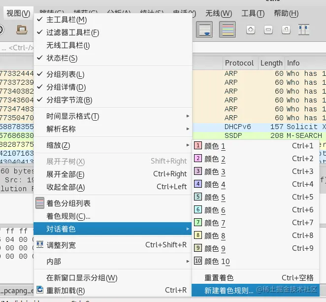 在软件的核心界面就是数据包列表,显示的列有序号、时间、源IP、目标IP、协议、长度、基本信息。Wireshark使用不同的颜色对不同的协议做了区分。在视图菜单,我们可以找到和着色相关的命令。