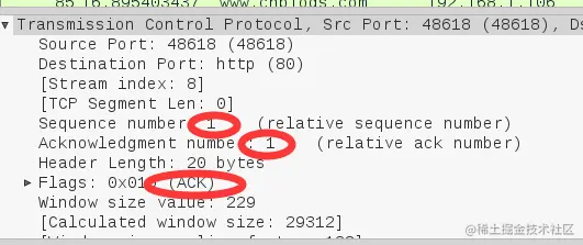 80号数据包TCP字段如图32所示,客户端再次发送确认包(ACK) SYN标志位为0,ACK标志位为1.并且把服务器发来ACK的序号字段+1,放在确定字段中发送给对方。