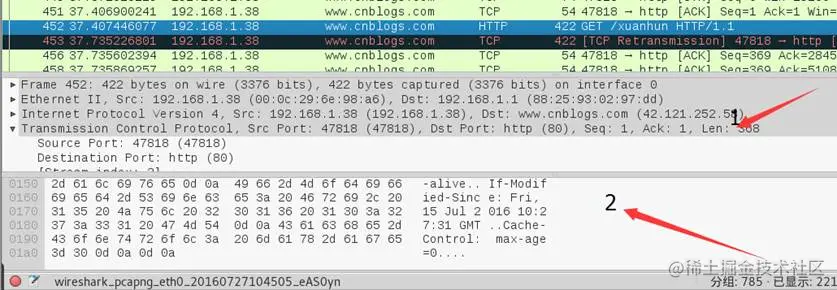 1.5.4 数据分析 选中某一条数据项,会在如图23所示的两个区域,显示该数据包的详细信息。