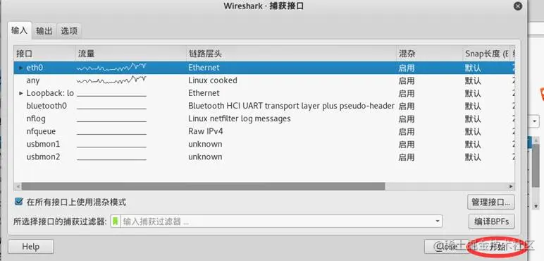 启动Wireshark后,在主界面会列出当前系统中所有的网卡信息。