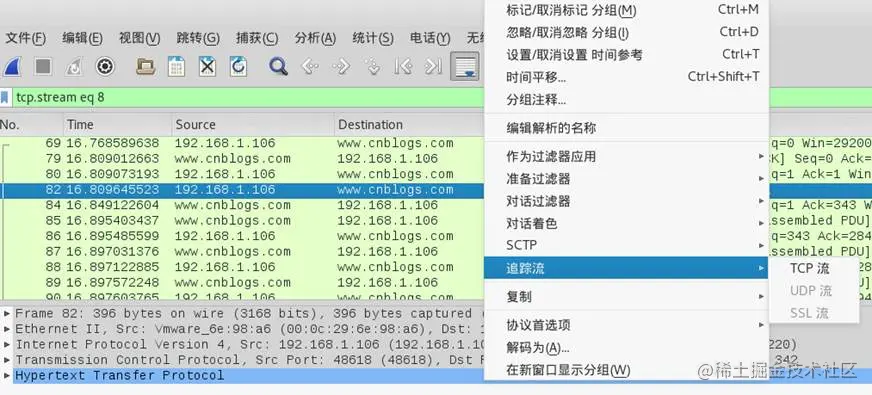 选中一个,右键然后点击"追踪流"——>TCP流。
