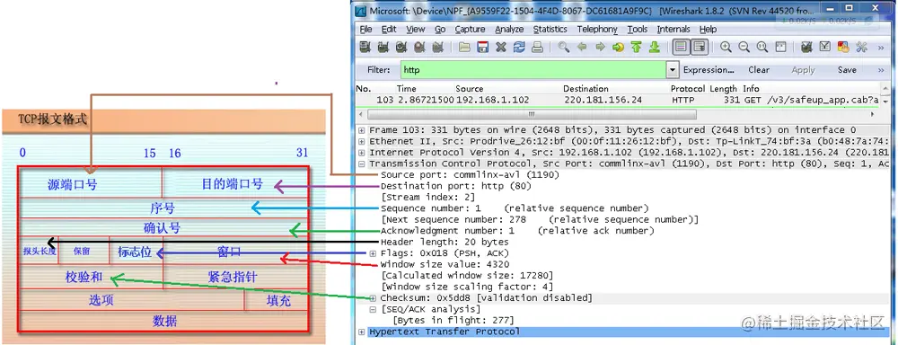 Transmission Control Protocol: 传输层T的数据段头部信息,此处是TCP -