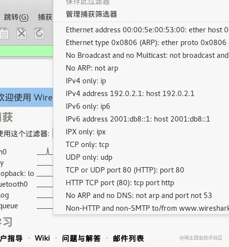 捕捉过滤器是用来配置应该捕获什么样的数据包,在启动数据包捕捉之前就应该配置好。打开主界面“捕获”——>“捕获过滤器”。