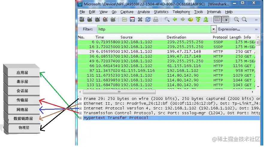 是时候把教科书搬出来了,在图25中,看到OSI七层模型和Wireshark数据包分析的对应情况。
