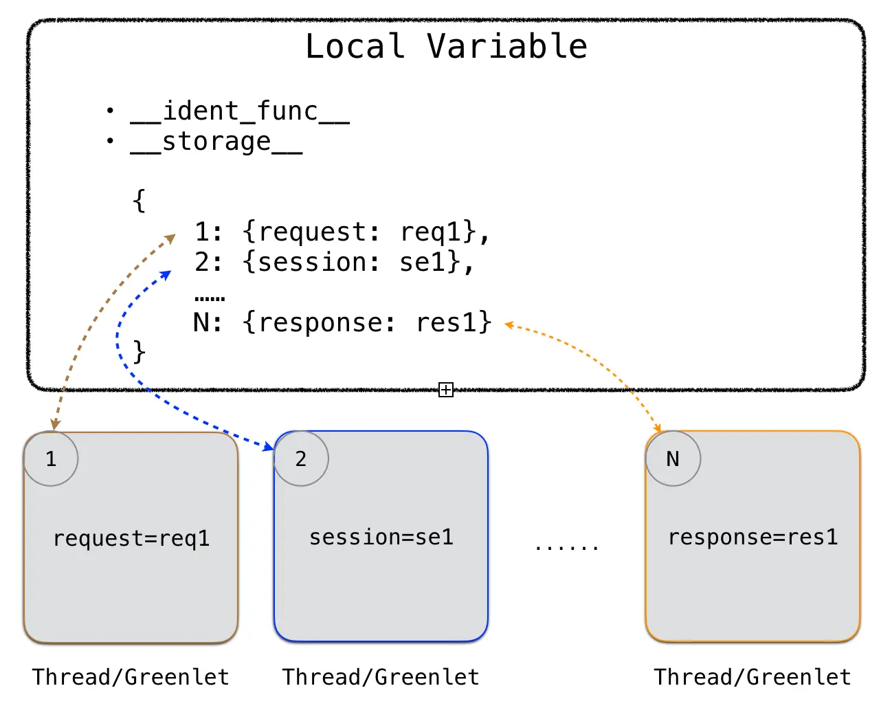 Local 和 LocalStack 都是线程或者协程独立的单个对象,很多时候我们需要一个线程或者协程独立的容器,来组织多个Local或者LocalStack对象(就像我们用一个list来组织多个int或者string类型一样)。