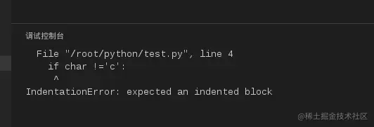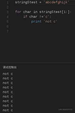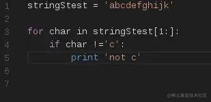 这段代码很简单,首先声明了一个字符串变量stringStest,然后遍历字符串中的中的字符,判断是不是字母“c”,如果不是打印“not c”。运行之后,会看到如下错误: